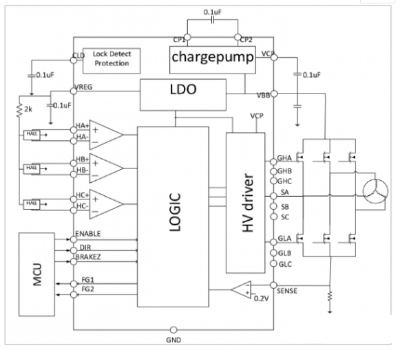 GC4931F/S 的邏輯輸入腳有使能控制(ENABLE) , 方向控制(DIR) , 剎車控制(BRAKE) ; 邏輯輸出腳有 FG1, FG2 與霍爾信號對應, 可以用來監測轉動速度。芯片工作溫度從-20~105℃。 封裝形式采用5mmx5mm 的 QFN 28 腳, 底部有散熱片。GC4931F 工作電壓低至 4.7V, GC4931S最低工作電壓在 7V.