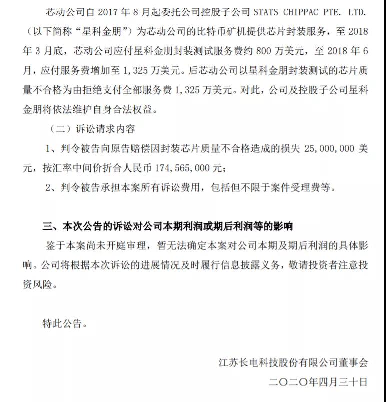 芯動公司自 2017 年 8 月起委托公司控股子公司 STATS CHIPPAC PTE. LTD. (以下簡稱“星科金朋”)為芯動公司的比特幣礦機提供芯片封裝服務(wù),至 2018 年 3 月底,芯動公司應(yīng)付星科金朋封裝測試服務(wù)費約 800 萬美元,至 2018 年 6 月,應(yīng)付服務(wù)費增加至 1,325 萬美元。后芯動公司以星科金朋封裝測試的芯片質(zhì) 量不合格為由拒絕支付全部服務(wù)費 1,325 萬美元。對此,公司及控股子公司星科金朋將依法維護自身合法權(quán)益。